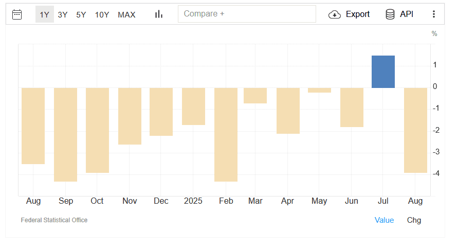 Il crollo della produzione industriale in Germania dall’agosto 2024 all’agosto 2025