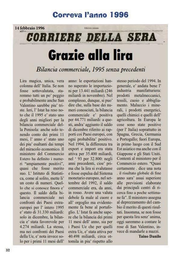A via Solferino si scriveva che la lira era la protagonista della risalita dell’Italia dopo l’annus horribilis del 1992, quando intenzionalmente Ciampi difese scelleratamente il cambio fisso contro il marco pur di restare nello SME, mentre la Germania faceva fatica a decollare per via di una moneta troppo pesante.